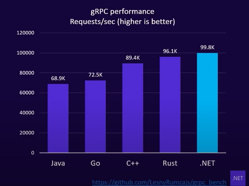 C#の特に優れている点として、パフォーマンスの高さが挙げられます。.NET Framework時代はパフォーマンスを指向してこなかったこと、JVMに近いアーキテクチャをしているところなどから誤解されがちですが、現在の.NETランタイムは極めて高速で、gRPCなどのいくつかのベンチマークではRust製のフレームワークに匹敵する速度を叩き出しています。