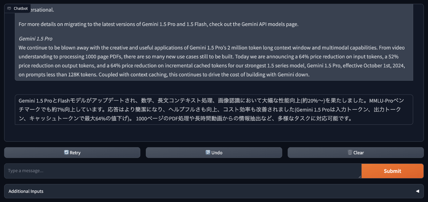チャットの入力画面が出たら好きな内容を入力して Submit すると Gemini モデルからの応答が確認できます。
