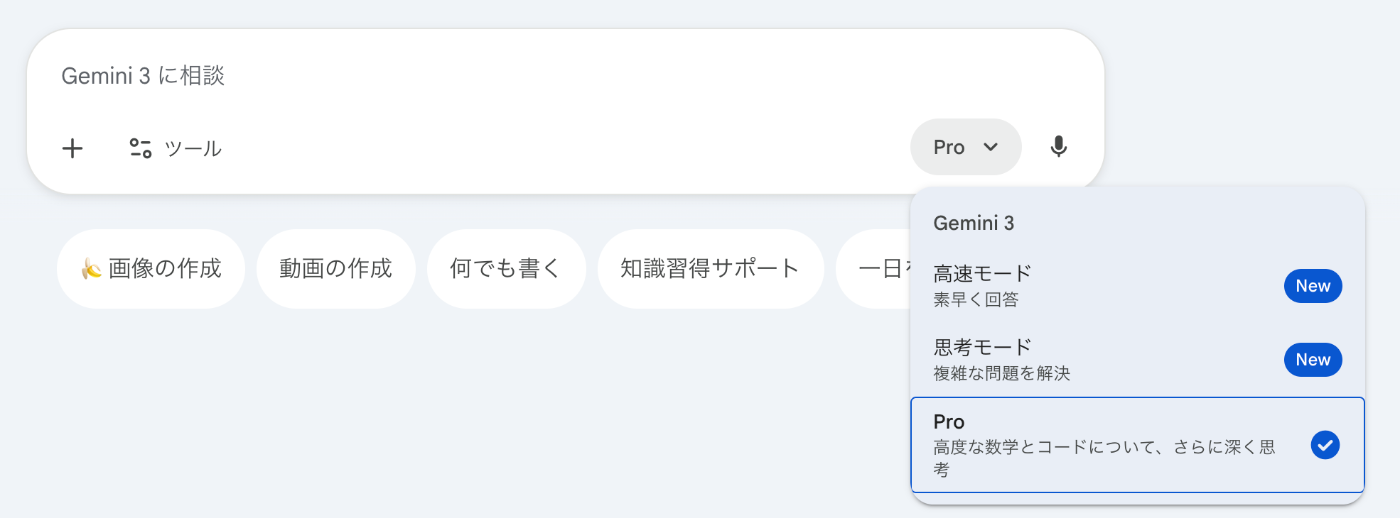 | 思考モード | Gemini 3 Pro Image(Nano Banana Pro) | 高品質、複雑な指示に対応 |
