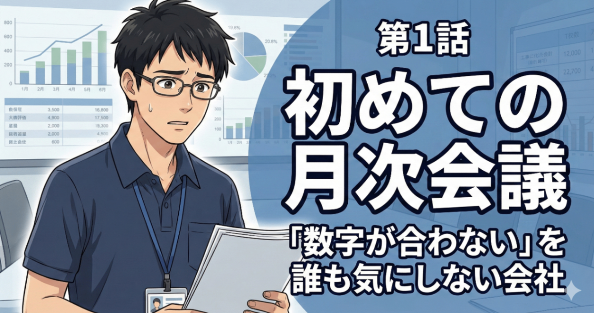 月次経営会議の場面。主人公の尾形が、会議中に配布資料と