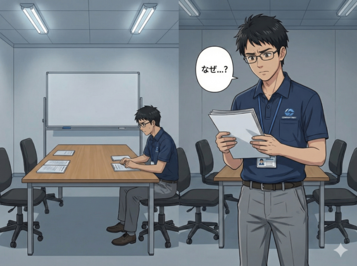 - 会議室:窓なし、蛍光灯、木目調テーブル