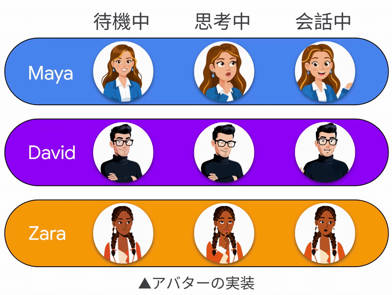 さらに、各エージェントにペルソナと表情豊かなアバターを実装しました。