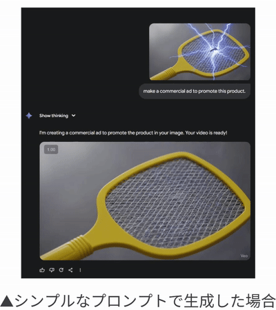 最初、「この画像で商品CMを作って」とシンプルなプロンプトを試しました。