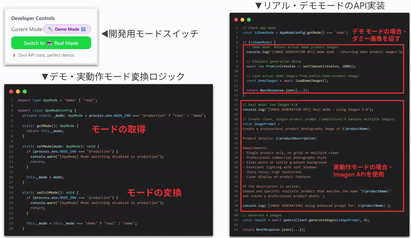 - デモ/リアルモード二重実装: 機能開発時は低コストなデモモードで迅速に検証し、承認後にリアルモードに同期展開