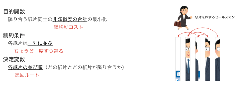 似ているかどうかを類似度と呼ぶことにすれば、「隣り合う紙片の類似度が最大となる紙片の並べ方を見つけなさい」という問題と捉えることができます。また、どれくらい似ていないかを非類似度と呼べば、「隣り合う紙片の非類似度が最小となる紙片の並べ方を見つけなさい」という問題とみなせます。これはいわゆる巡回セールスマン問題です。
