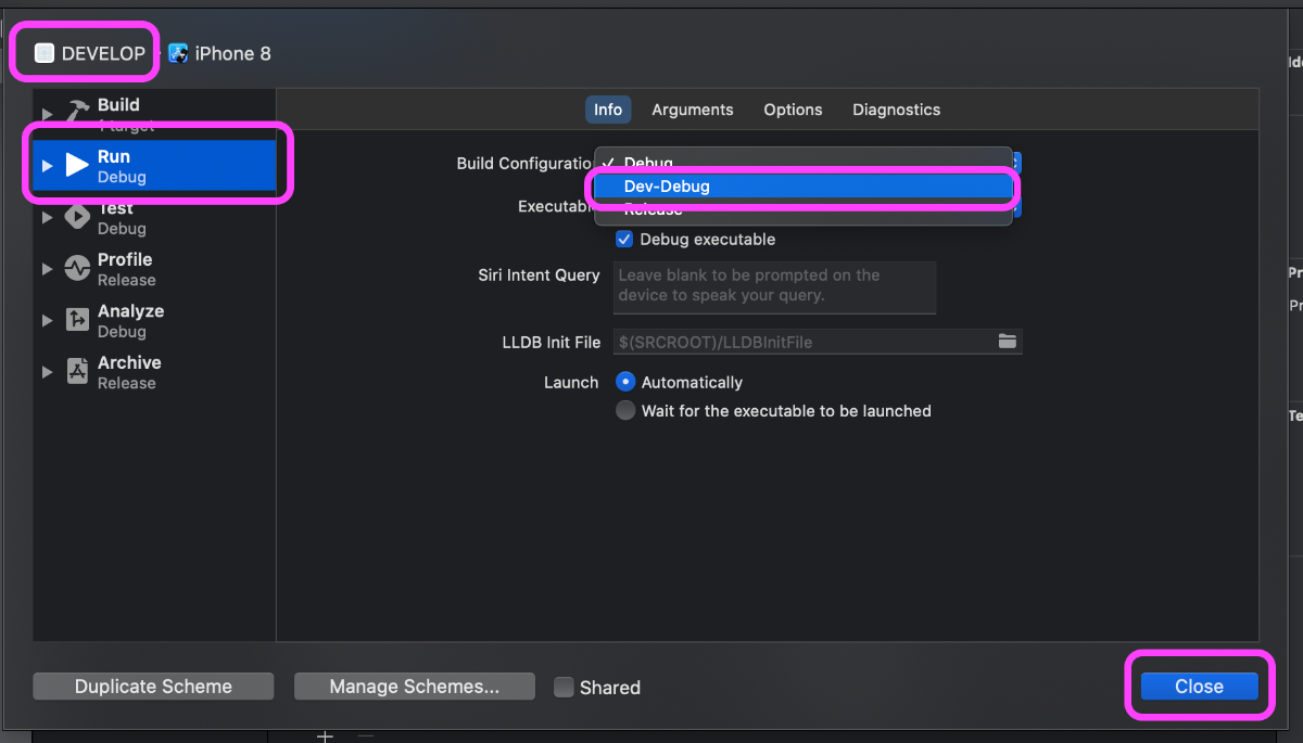 Dev-Debugの値に「-D 先ほどの任意の名前」を設定