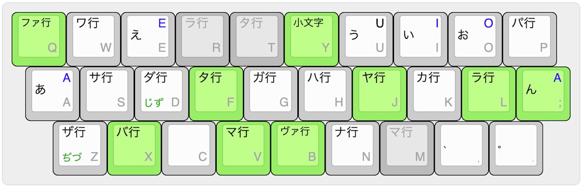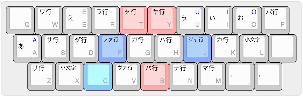 指の負担を抑えたいなら「子音キーと反対側の母音 A を押す」というルールに、速度を上げたいなら「子音キーと同じ側の母音 A を押す(押しにくいものは除く)」というルールにするとよいでしょう。