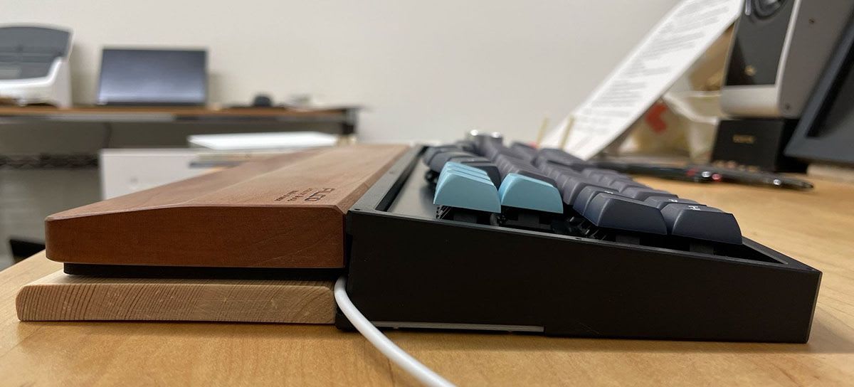 (※本当に手首が楽なので、本などを積んで下図のようにして試してみてください。キーキャップを交換できるタイプなら、親指キーの上下を反転させるとなおよし。)