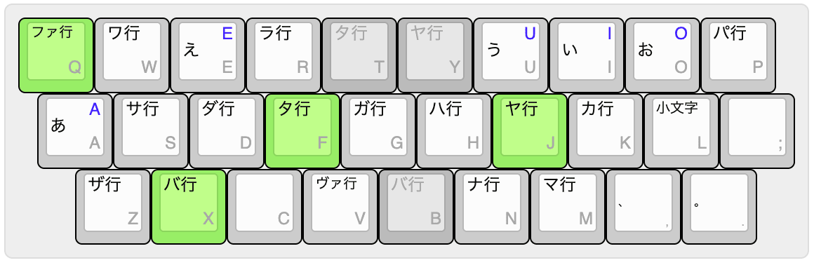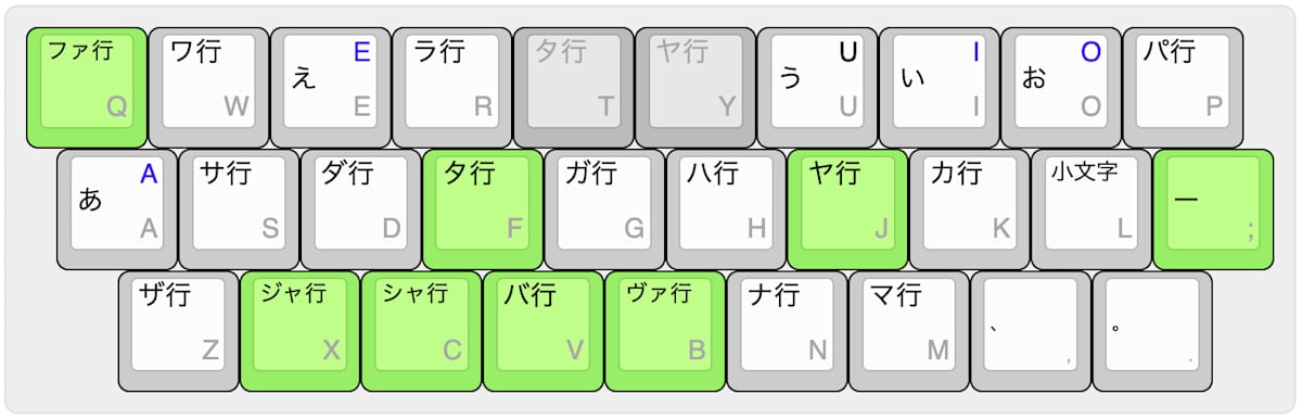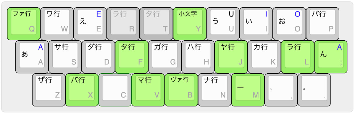「ファ行」は何気に使うので、「パ行/P」の鏡面位置にあって覚えやすい Q に移動します。こうしておくと、練習期間も T キーと Y キーはそのまま使えますので緩やかに移行できます。
