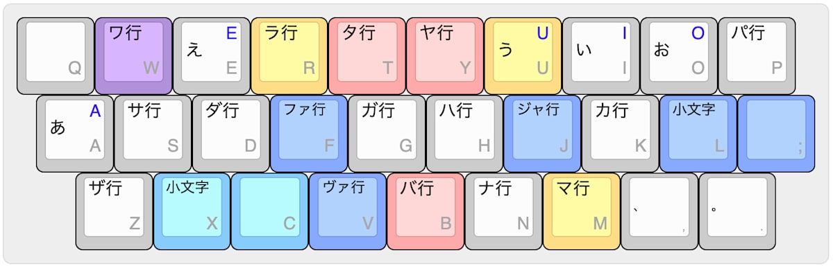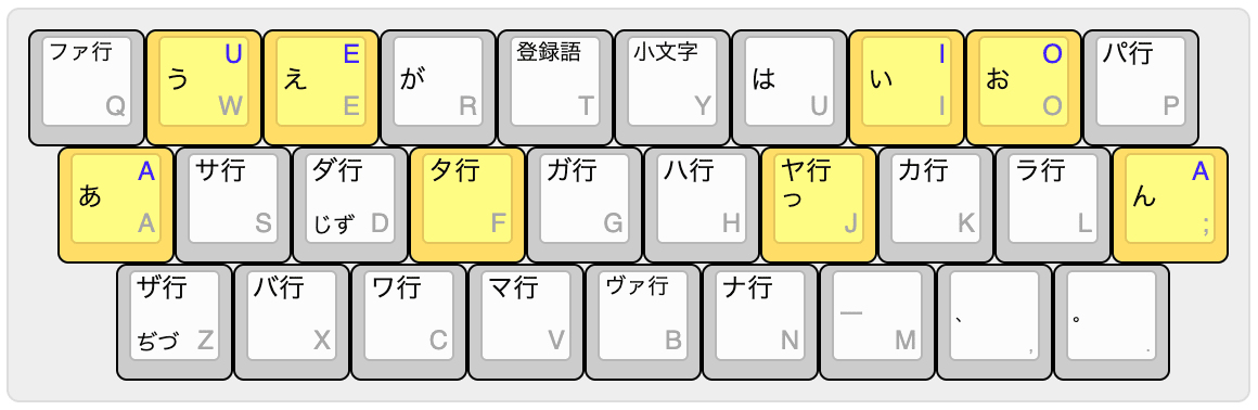 上図のとおり、最大の特徴は両手側に母音キーがあることです。キーを押す順番の違いで、一つのキーが母音キーになったり子音キーになったりします。基本的に左右交互打鍵になります(速度重視ではなく疲労軽減重視)。