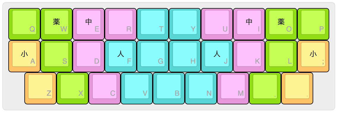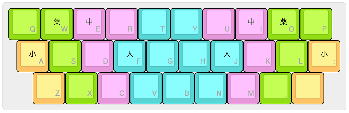 ここまでは行段配列人差し指が短い私は、ホームポジションも変えて、下図のように中指と薬指を常に上の段に置いています。
