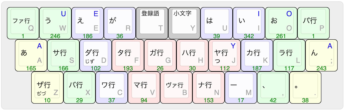 参考までに各キーの使用頻度(単位:万)も表示しています(頻度計算用データの入手先を失念してしまいました)。母音「A」は、子音と逆側を使う場合で計算されています。