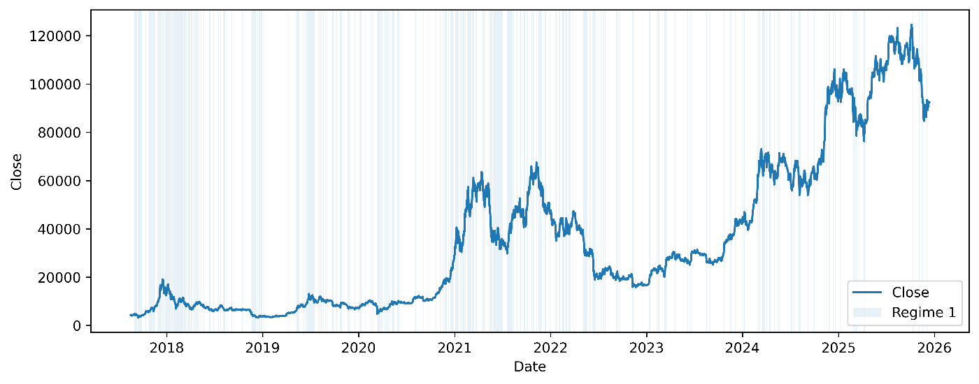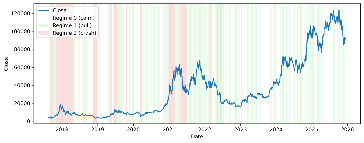 しかしながら,2023年以降にクラッシュレジームがほとんど出現しない点は「相場が実際に安定していた」可能性と「モデルがクラッシュを検出できていない」可能性の両方があるため,別期間・別仕様での検証余地が残る.