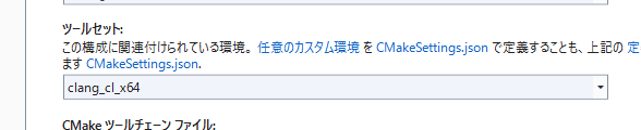 CMakeプロジェクトであれば、toolsetとして clang_cl_x64