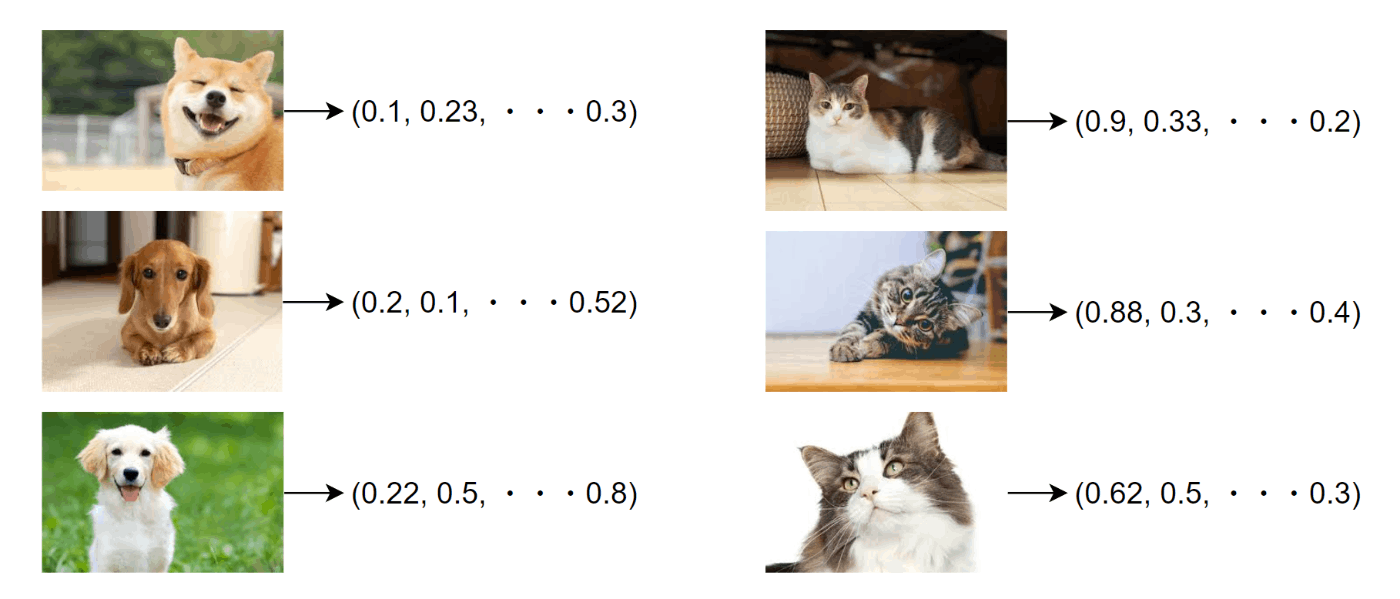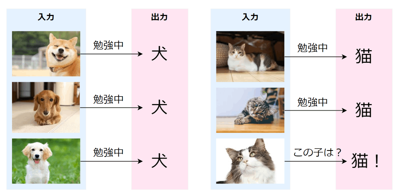 例えばこんな感じで、画像と答えのペアを渡すことで猫と犬を識別できる。という認識。