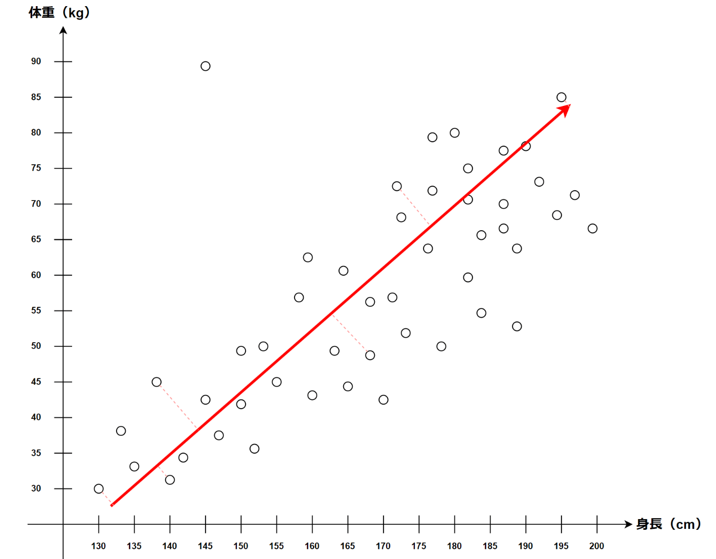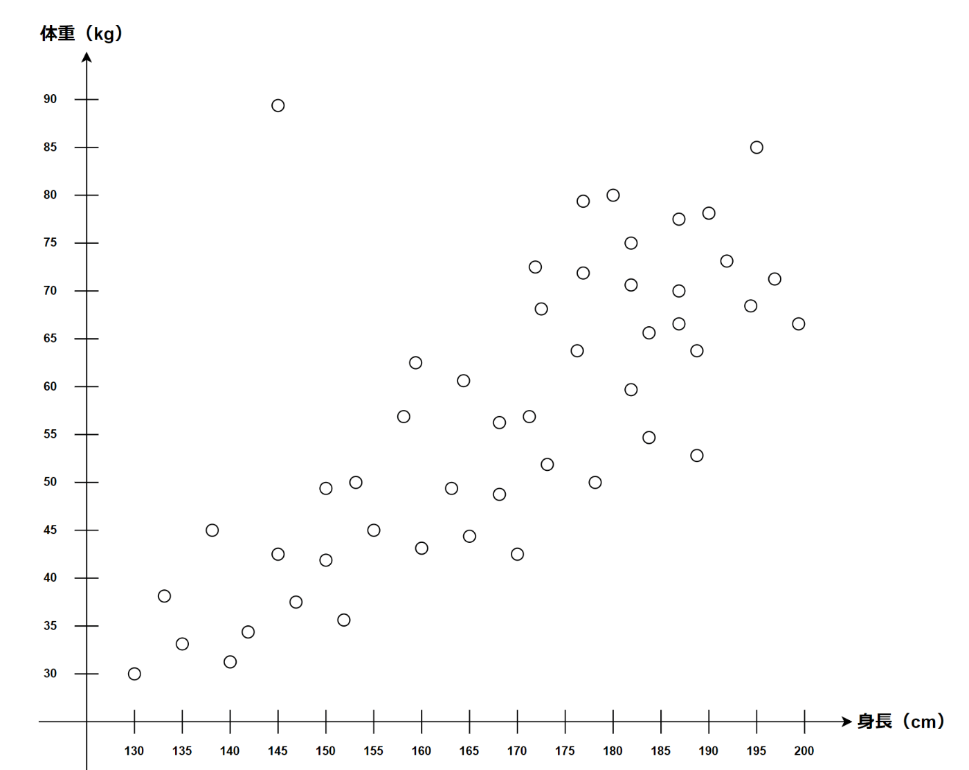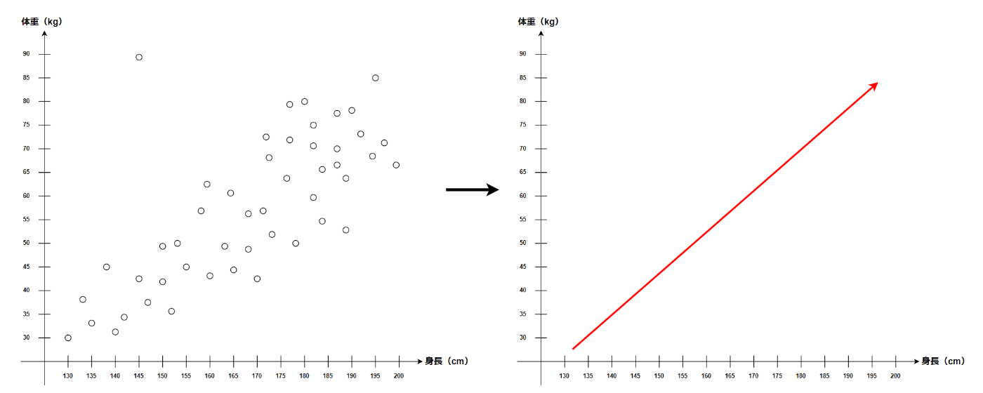 身長と体重の関係性、つまりこのデータプロットの特性が分かる。