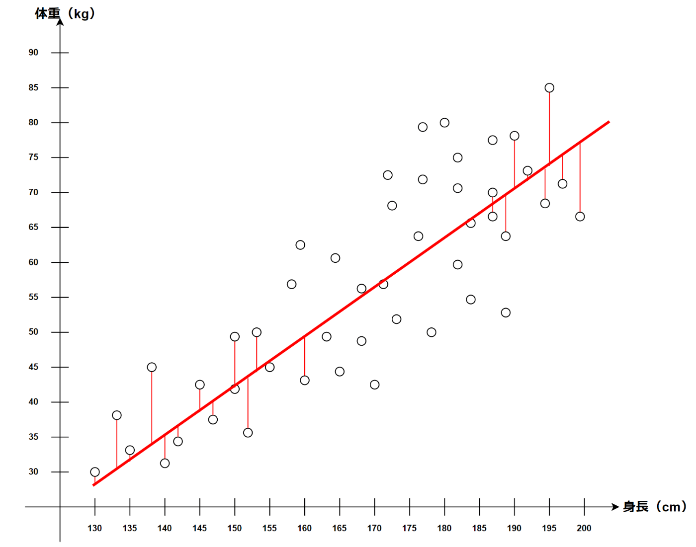 具体的には、予測した値と実際の値の差(誤差)を小さくするように直線を引く方法。