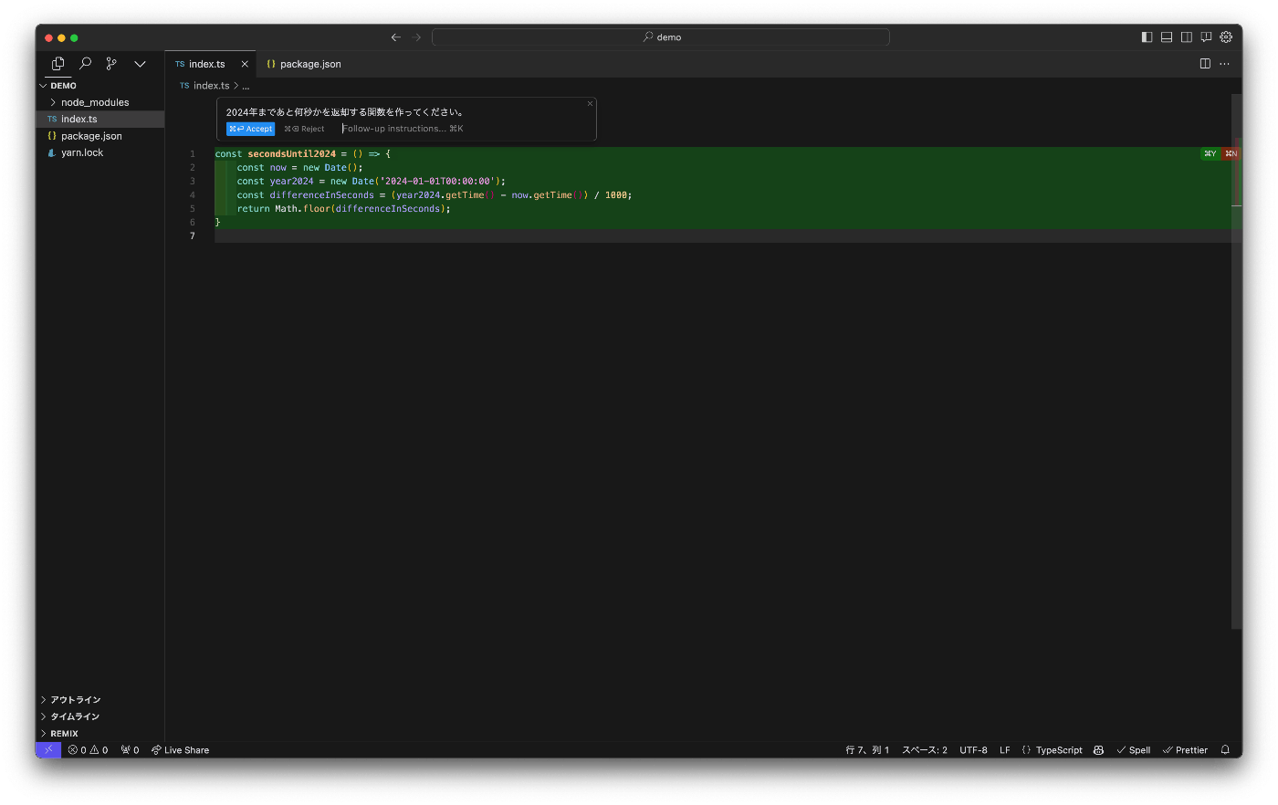 ・「⌘+K」: 既存のコードに対して変更をリクエストする