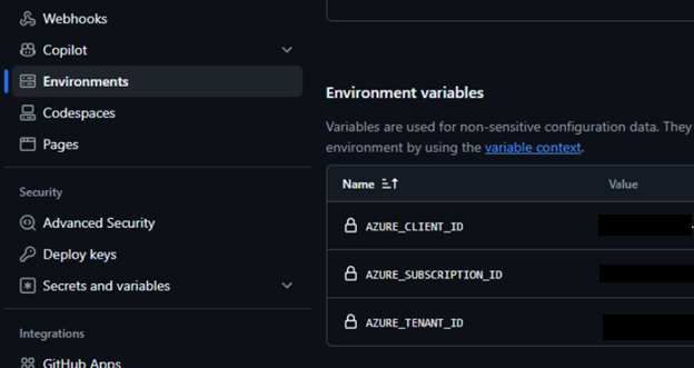 Next, the gh command is used to perform the necessary settings on the GitHub repository side. First, an environment for the Coding Agent is created, and the credentials for the previously mentioned MI are registered as environment variables.