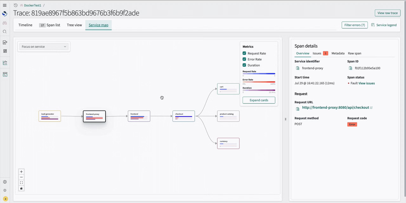 本リリースでは、実験的機能としてReact FlowライブラリをOpenSearch Dashboardsコアに追加し、インタラクティブなノードベース可視化のための標準化されたフレームワークを提供します。この統合により、個々のプラグインがライブラリのコピーをバンドルした際に発生していたバージョン競合が解消され、一貫したユーザーエクスペリエンスを提供します。このライブラリは現在、Discover Traces機能と共に使用され、トレーススパンとサービス依存関係を可視化するサービスマップをレンダリングします。従来のチャートライブラリとは異なり、React Flowはワークフローとネットワークダイアグラムに特化し、ドラッグアンドドロップのインタラクション、カスタムノードコンポーネント、アクセシビリティへの準拠を維持しながら数千のノードを効率的にレンダリングします。この機能を有効にするには、こちらのステップバイステップガイドを参照してください。以下は、インタラクティブなノードベースの可視化の例です。
