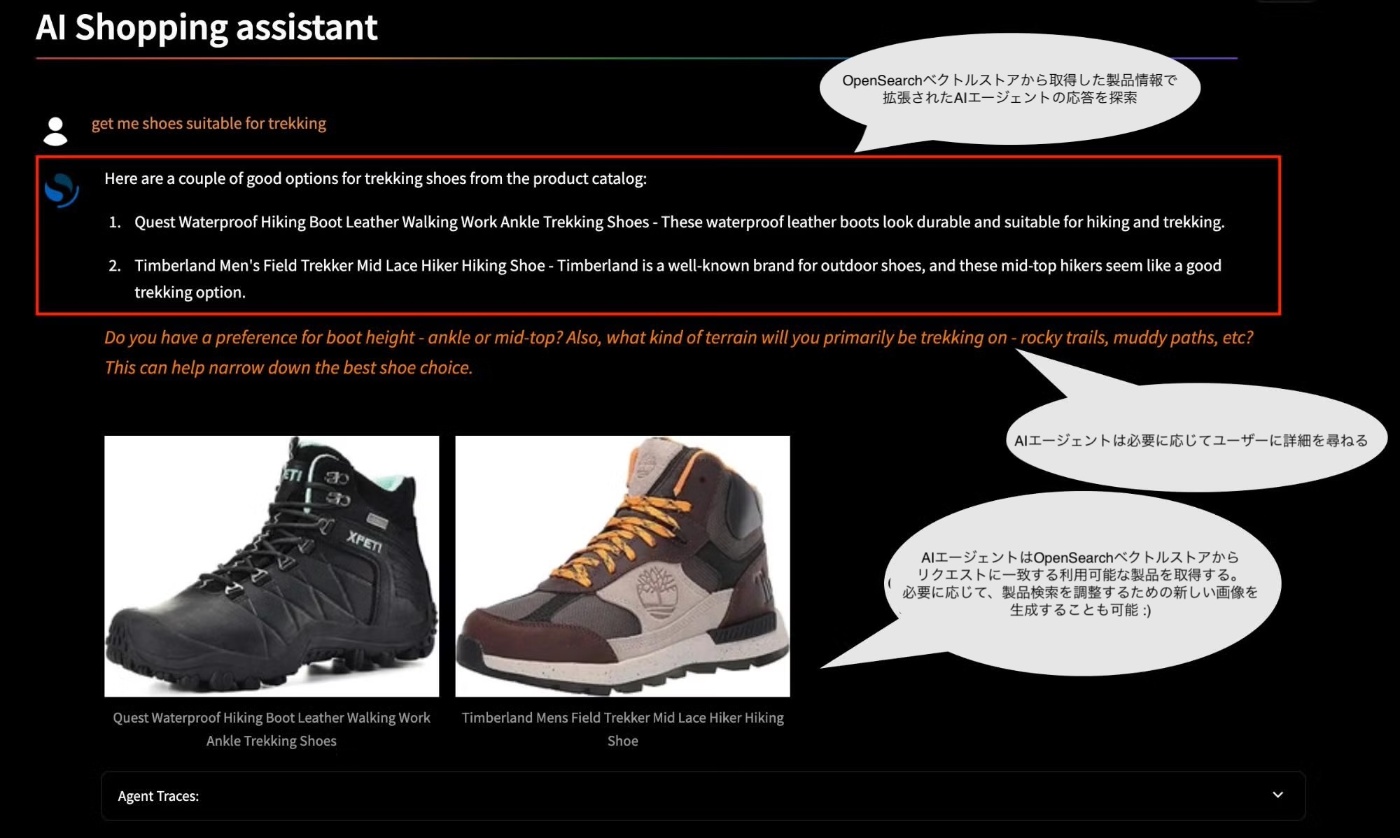 AIショッピングアシスタント:RAGは非構造化データ上のQ&Aシステム構築で広く知られていますが、eコマース製品検索への応用は、ユーザー体験を変革する新たな可能性を開きます。このソリューションでは、OpenSearch上の製品カタログに対してRAGとAIエージェントを組み合わせます。これにより、会話型ショッピング体験を提供できるエージェント型ショッピングアシスタントの作成方法を探求します。エージェントにユーザー意図の理解、クエリ書き換え、検索戦略の動的選択、検索結果評価、フィードバックベースのリトライ、パーソナライゼーションなどの機能を実装することで、製品カタログに対する適応的で高品質な検索を実現します。このアプローチは検索品質を向上させるだけでなく、ユーザーが検索システムと自然に対話できるようになります。このモジュールでは、オリジナルのAmazon ESCIのeコマースデータセットから派生したデータセットを使用します。「アパレル」と「フットウェア」製品カテゴリから合計59,300製品のサブセットを利用しています。AIショッピングアシスタントのインタラクション例を以下の画像に示します。