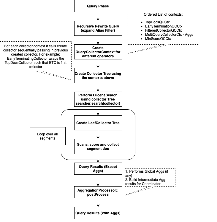 各セグメントに対して、Lucene はクエリで提供されたフィルターとブール句を適用し、一致するドキュメントを特定してスコアリングします。その後、一致したドキュメントはコレクターツリーを通過し、一致したドキュメント ID が収集されます。例えば、TopDocsCollector は上位の一致ドキュメントを収集し、さまざまな BucketCollector オブジェクトはアグリゲーションタイプに応じて一致するドキュメントの値を集計します。