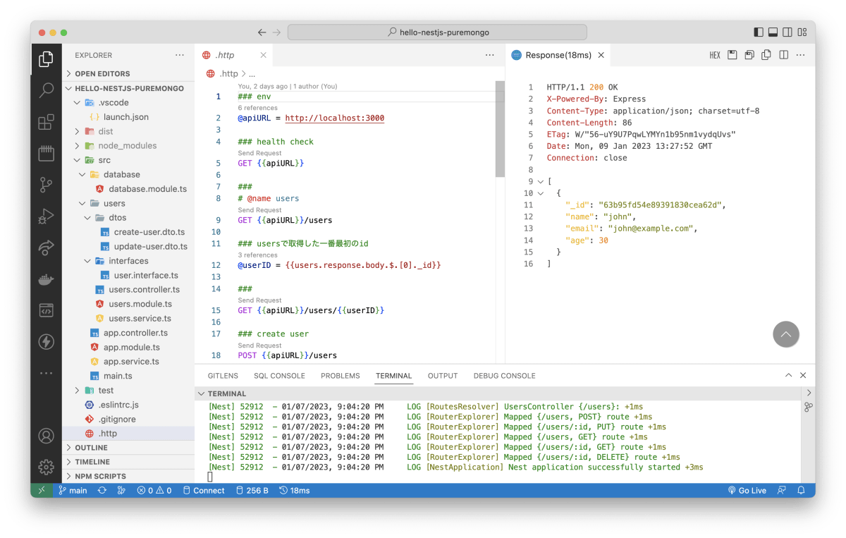 残りの下記ファイル等は、GitHub - optimisuke/hello-nestjs-puremongoに置いてるので、そっち参照。.httpはREST Client用のファイル。API の動作確認に使用。