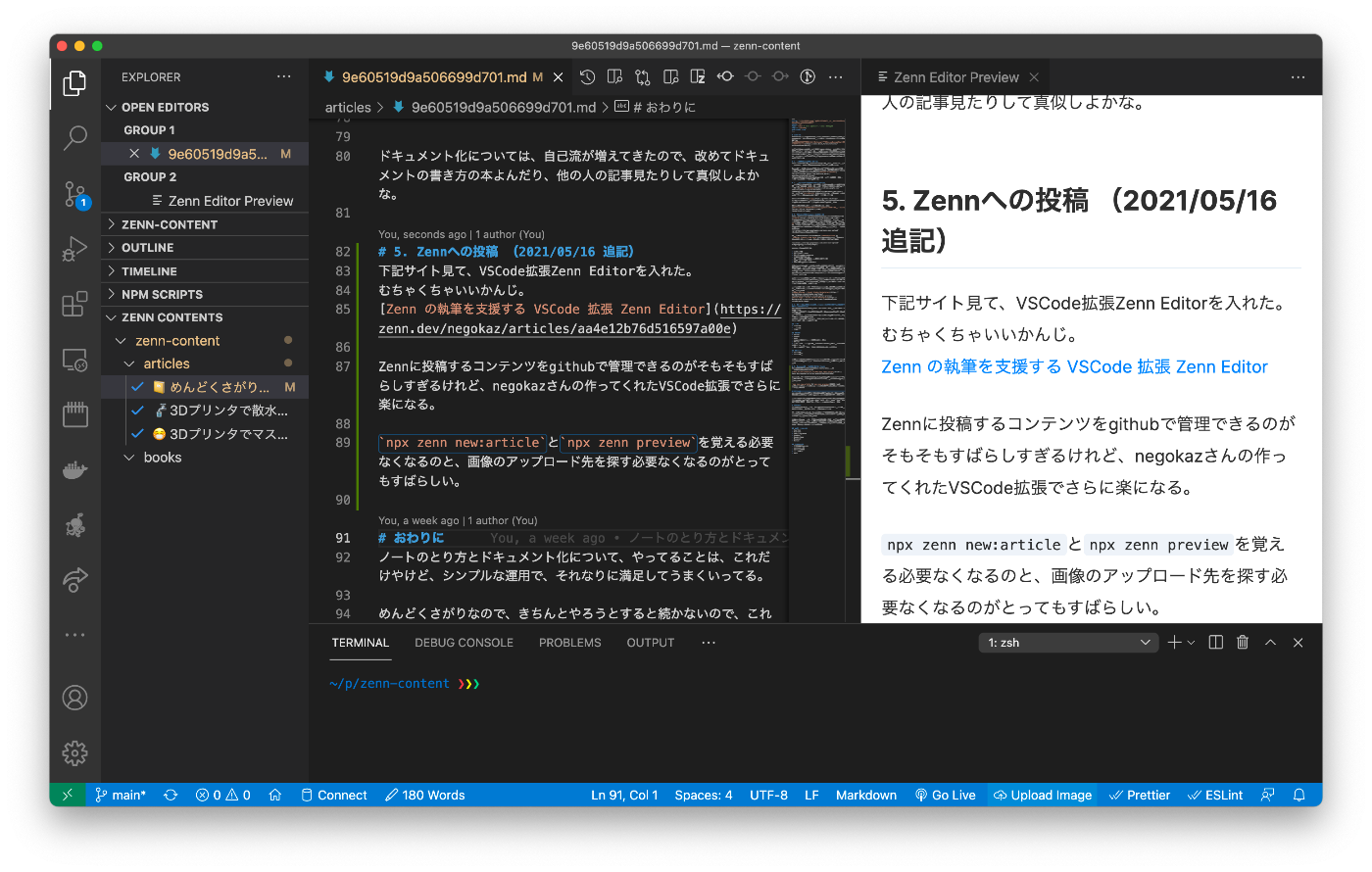 Zennに投稿するコンテンツをgithubで管理できるのがそもそもすばらしすぎるけれど、negokazさんの作ってくれたVSCode拡張でさらに楽になる。
