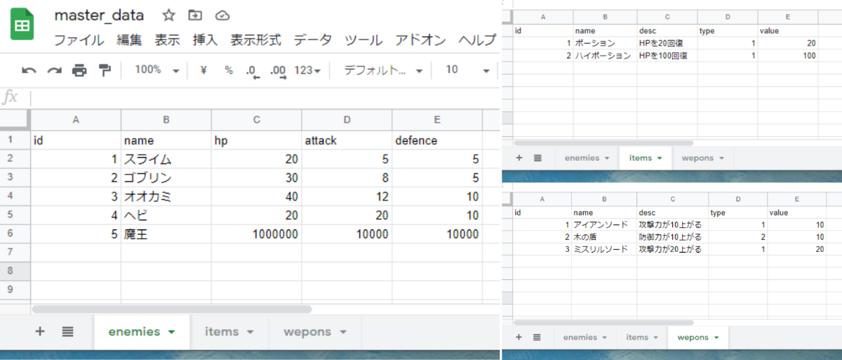 趣味で作ってるゲームのマスターデータを SpreadSheet で管理しています。