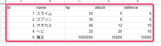 [ 1, 'スライム', 20, 5, 5 ],