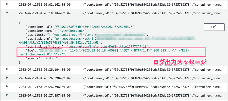 というキーの値が出力したログ出力メッセージとなっているようです。その他、コンテナ情報や ECS タスクの情報のようなメタ情報も合わせて出力されていました。出力内容については、必要に応じて変更しておくと良いかと思います。