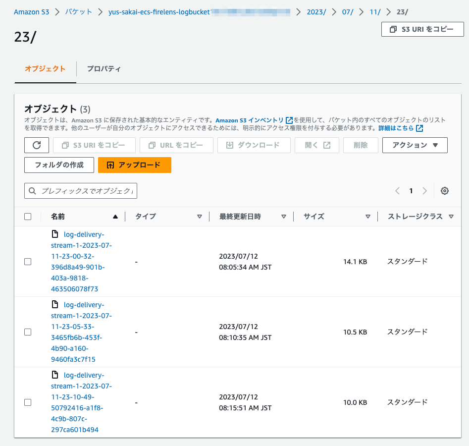 ここで作成した Kinesis Data Firehose にログをルーティングするように設定ファイルで定義しているので、設定ファイルで指定した delivery_stream