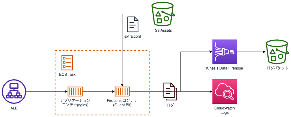 Fargate で実行しているコンテナのログを、FireLens を利用して CloudWatch Logs と S3(Kinesis Data Firehose を経由させて) にログをルーティングしてみました。ログのルーティングは AWS が提供してくれている Fluent Bit イメージを利用し、サイドカーパターンで配置します。これらのリソースの実装を CDK を利用して実装していきます。