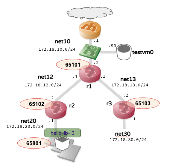 図のような環境で検証します[7]。左下の r2 というルータの下にOpenShiftのノードがいます。OpenShiftは v4.20.2上にMetalLB Operatorをインストールしました。上述したように、MetalLBのバックエンドはデフォルトでfrr-k8sになります。