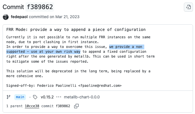 具体的には、バックエンドとしてFRRを使う場合、FRRのコンフィグテンプレートは外部から学習した経路をdenyするroute-mapが設定されるようになっています。ConfigMap bgpextras を使ったカスタムルールで上書きする方法は存在しましたが[2]、正式サポートな機能ではなく[3]、ドキュメントにも載っていないため(多分)、おそらく使っている人はほとんどいなかったのではないかと思います。