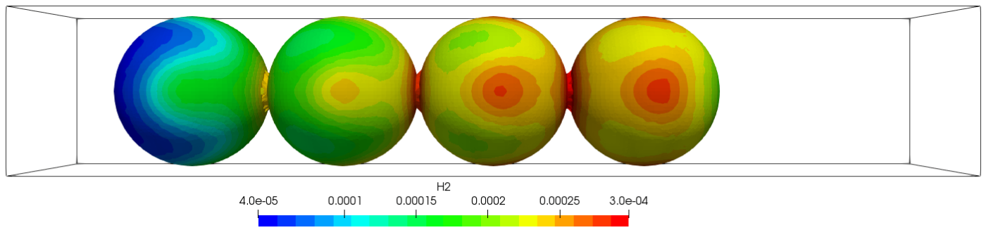 以上の設定により、触媒表面での反応生成物が境界層を通じて拡散していく様子をシミュレーションしています。