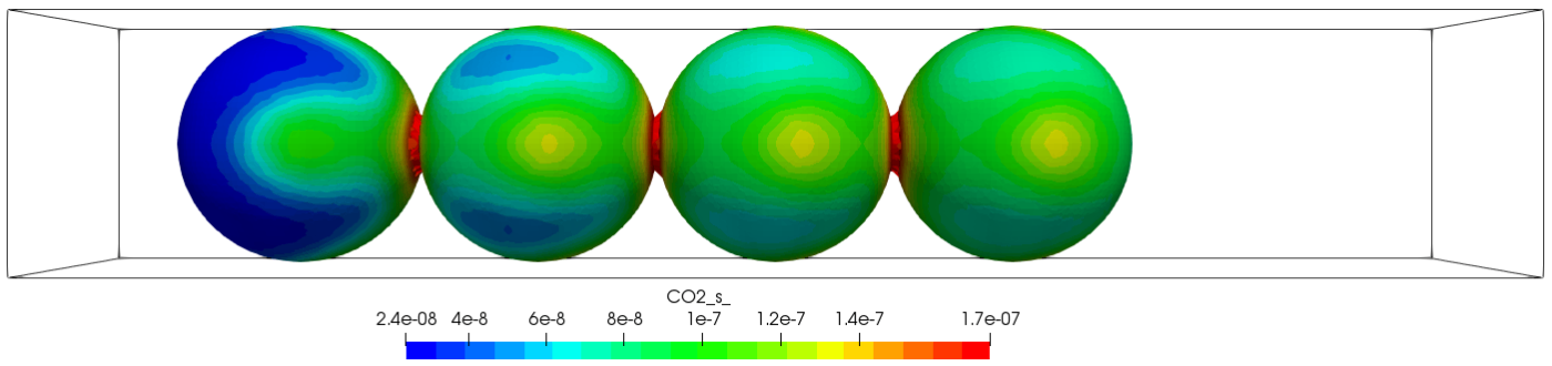 右側入口より とCO が流入して球状触媒表面に付着していることが分かります。H_2O