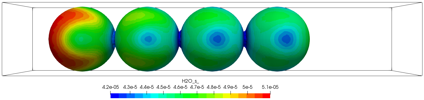この解析は、高温(850 K)のガス流中に置かれた球状触媒粒子表面における化学反応の過渡変化を、0.0~0.1秒の時間範囲でシミュレーションしたものです。