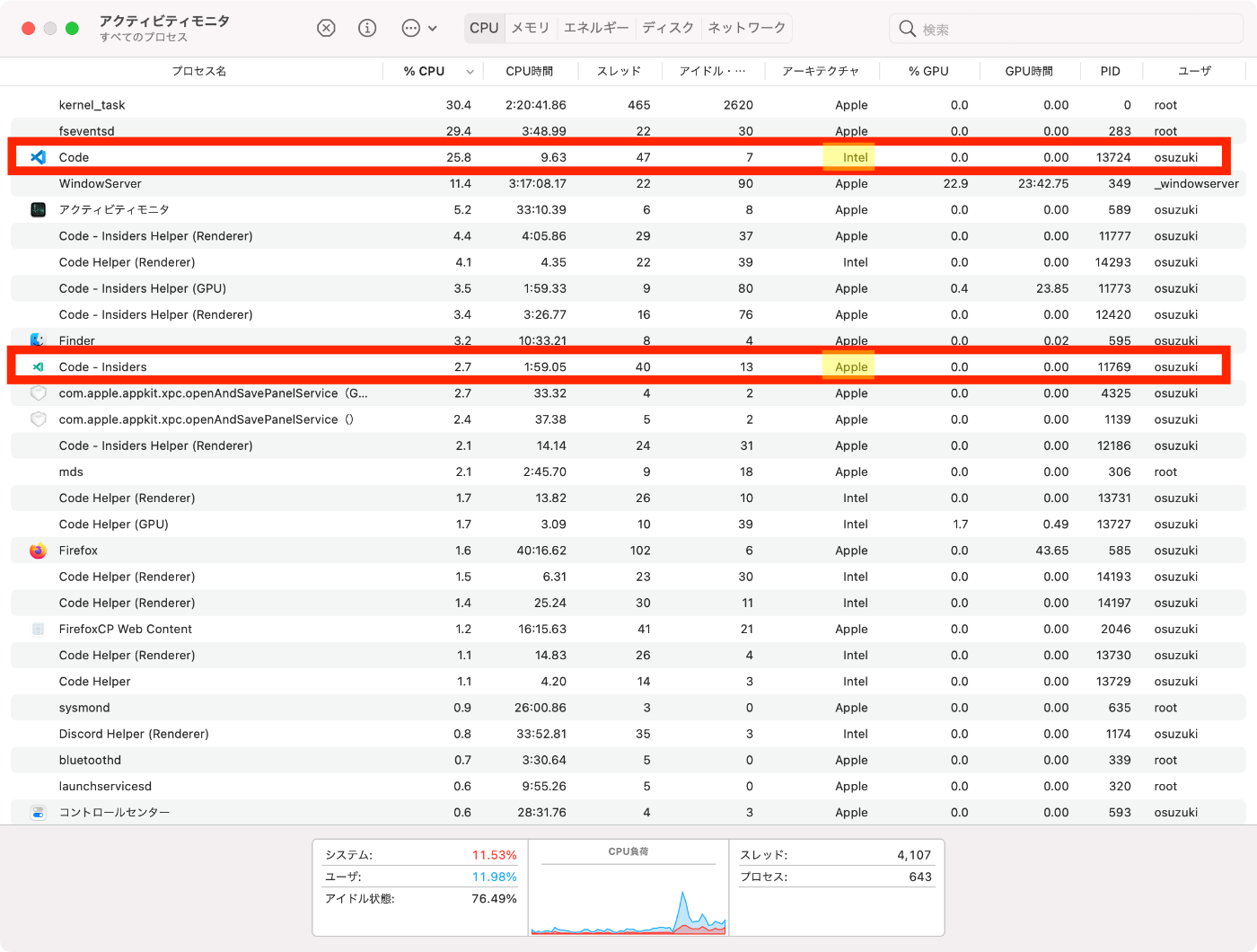 - アクティビティモニタ使えば
