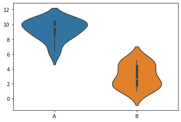 sns.violinplot(x=['A' for i in range(len(A))]+['B' for i in range(len(B))],