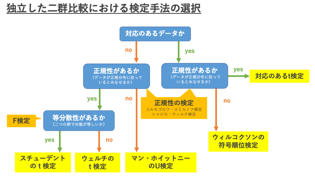 - 2群間の平均値が独立であり(データに対応がない)、かつ2群間に等分散性が仮定できる場合に用いる(下記図参照)