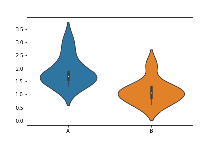 sns.violinplot(x=['A' for i in range(len(A))]+['B' for i in range(len(B))],