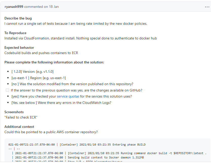 今のところ、@ ryanash999が述べたように、CodeBuildを再度実行しようとすると、回避策として問題を解決できます。ただし、Dockerの制限の問題に再び遭遇する可能性があるため、これは最終的な解決策ではありません。