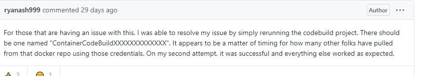 これに問題がある人のために。 codebuildプロジェクトを再実行するだけで、問題を解決できました。 「ContainerCodeBuildXXXXXXXXXXXXX」という名前のファイルが必要です。それらの資格情報を使用して、他の何人の人々がそのDockerリポジトリからプルしたかはタイミングの問題のようです。私の2回目の試みでは、それは成功し、他のすべては期待どおりに機能しました。