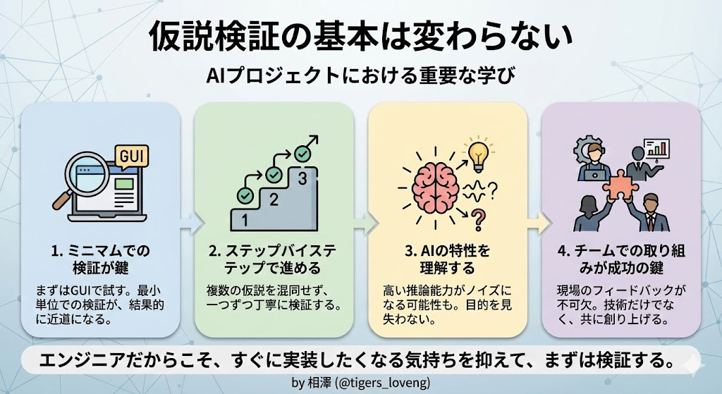 AIの推論能力が高いからこそ、逆に一足飛びに進めてしまいがちですが、基本的な仮説検証のプロセスは変わらないということを学びました。