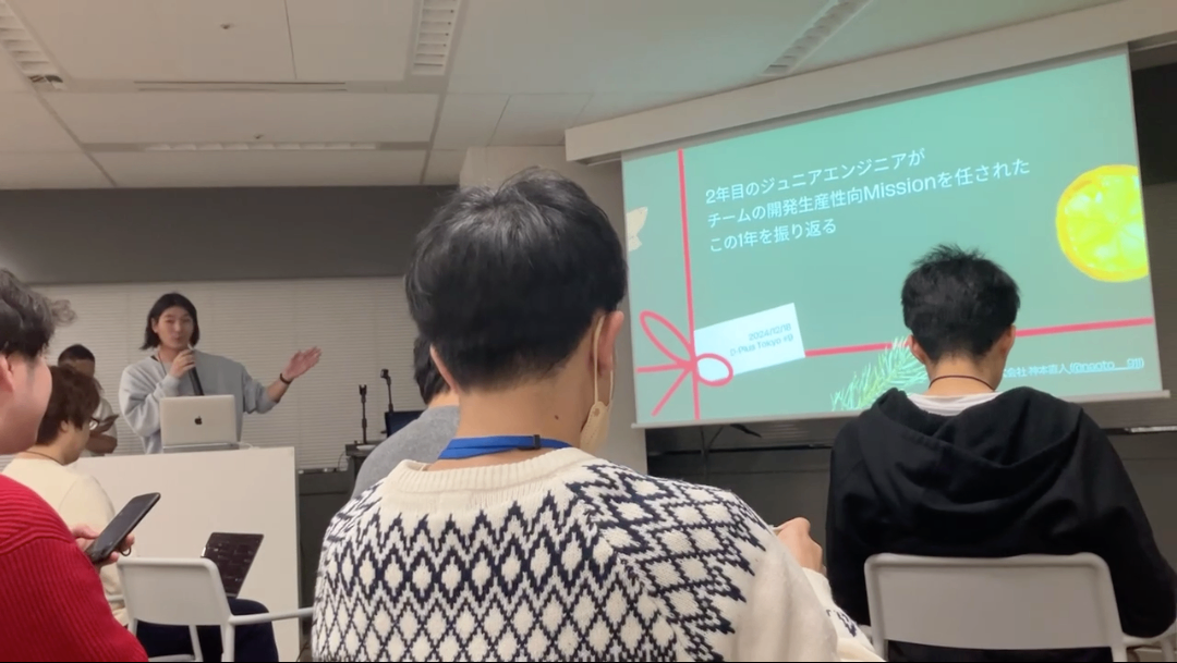 今年最後の開催ということもあり、テーマは「2024年大忘年会!開発生産性にトライした1年を振り返ろうLT会」ということで、神本が「2年目のジュニアエンジニアが チームの開発生産性向Missionを任された この1年を振り返る」というタイトルで登壇しました。