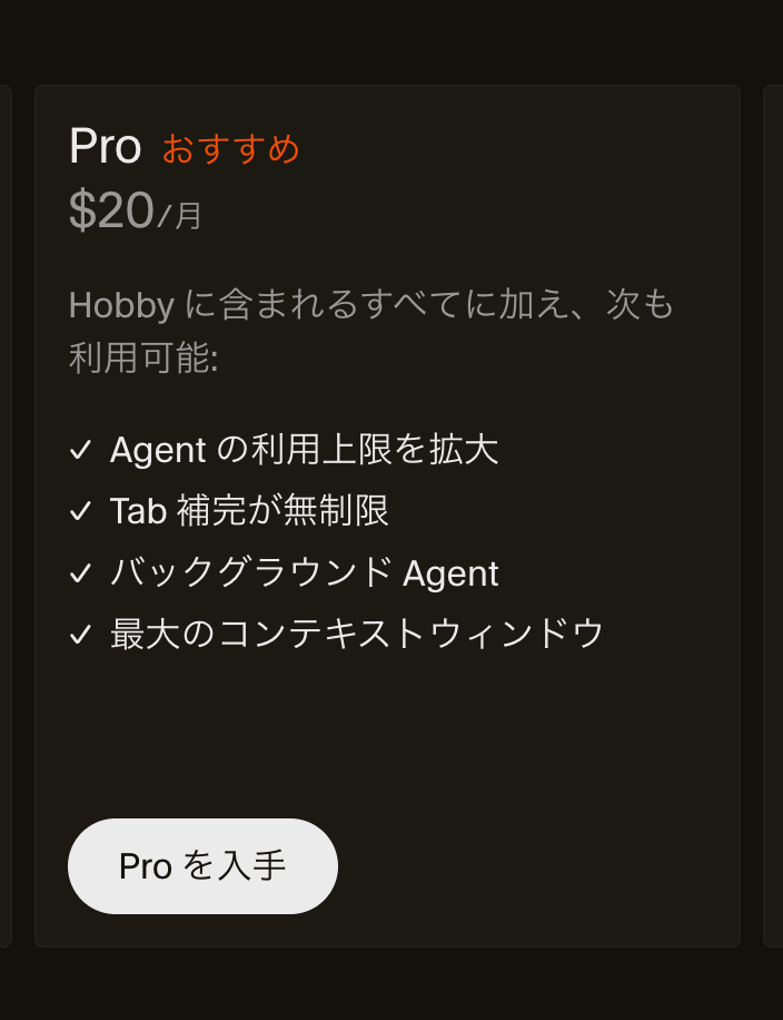 ちなみに $20/月について、Cursorのプランを紹介するページには書かれていません。