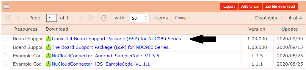 User Manualでは、「NUC980_Linux 4.4_BSP_v1.02.001」となっていますが、2022年7月時点では1.03のため、このバージョンをダウンロードします。