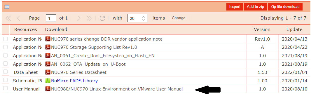 操作手順などは、Resources → Documentのファイル一覧から、NUC980/NUC970 Linux Environment on VMware User Manualをダウンロードして、内容をじっくり確認します。