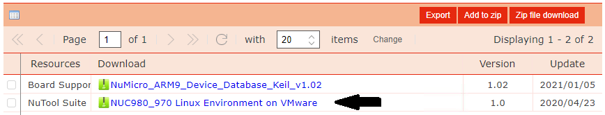 実際のUbuntuイメージファイルは、Softwareを選択して、ファイルの一覧から、NUC980_970 Linux Environment on VMware を探してダウンロード後、VMPlayerにインポートしてください。